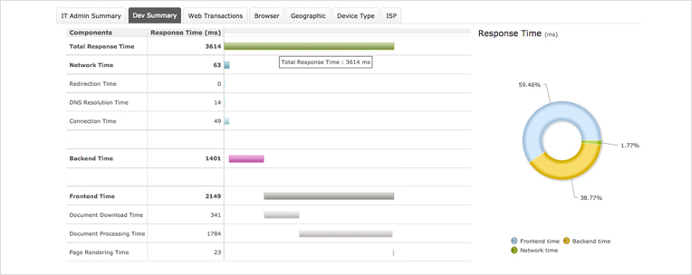 Clicking on the Dev Summary tab displays the response time under various components like network time,back end time and front end time.