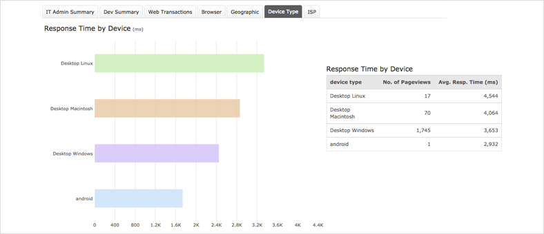 Clicking on the Device Type tab displays the avg. response time by devices. Here you can see response time metrics from various platforms like desktop, tablet, mobile and operating system.