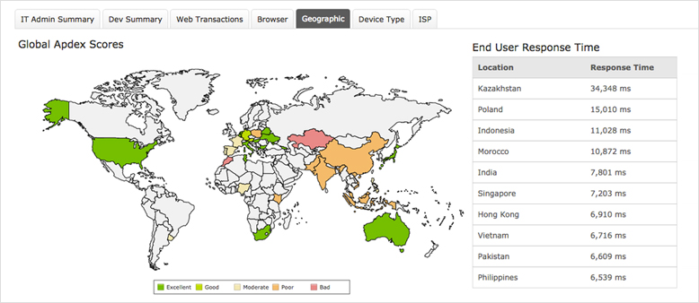 Clicking on the Geography tab gives a graphical representation of application response times globally and if it is excellent, good, moderate, poor or bad.