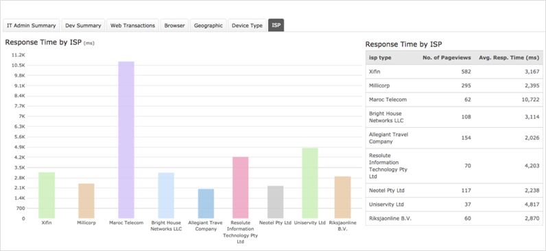 Clicking on the ISP tab displays the avg. response time by Internet Service Providers. Details include response time by ISP type, no. of requests and avg. response time.