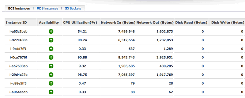 Each EC2 and RDS instance, discovered under the configured AWS monitor will also be shown individually in the Monitor Summary page. These EC2 and RDS instances will be displayed by their unique Instance ID. The EC2 instance can be identified by the icon and the RDS Instance can be identified by the icon .