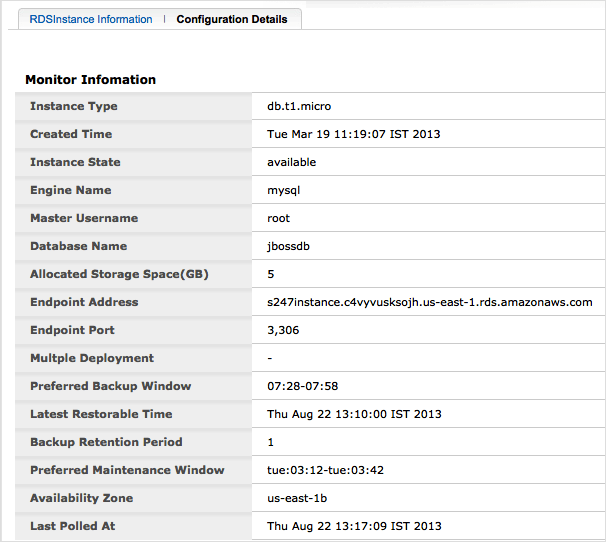 | Availability | Availability status of the particular RDS Instance after the most recent poll |