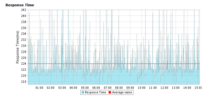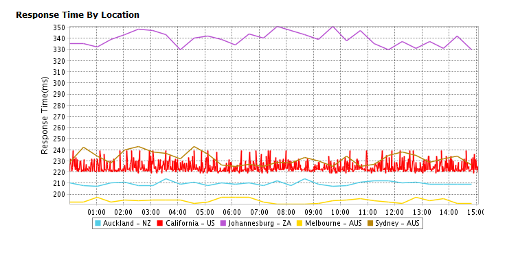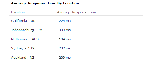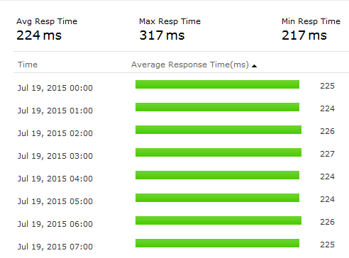 Response Time by Location graph provides the average DNS resolution time for each day or hour from every monitoring location. This data can be used to check the average response time of your monitors from different monitoring locations. Location legend is provided below the graph.