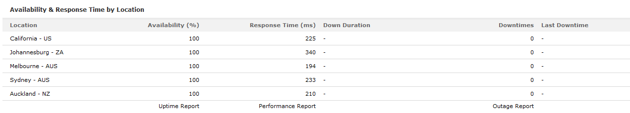 Attributes like Availability and Response Time of the DNS server from each monitoring location is shown in a tabular format. The total availability (%), Response Time (ms) and down duration from each monitoring location can be inferred from this report.