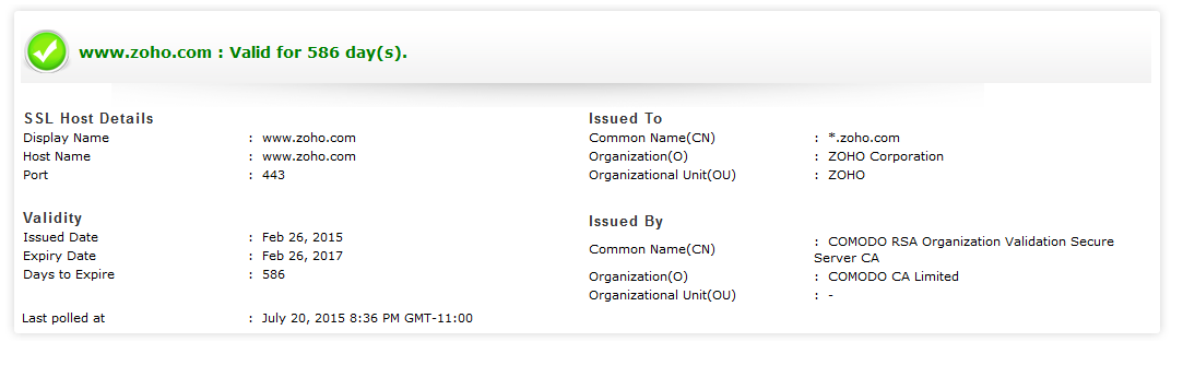 Navigate to Home page and click on the configured SSL certificate in the Monitor summary to get a detailed report on the status of the SSL certificate. The Validity of the SSL certificate is confirmed by a green tick followed by the domain name and the number of days to expire. Last polling status of the SSL Certificate Monitor is displayed at the end of the page.