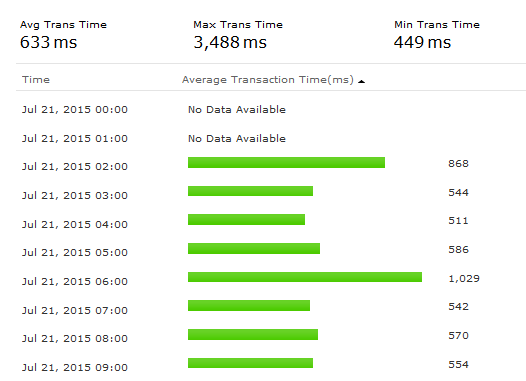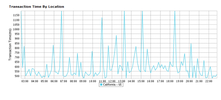 Transaction Time by Location graph shows the average transaction time for each day or hour from every monitoring location. This graph can be used to analyze the average transaction time of your monitor from different monitoring locations. The location is identified using legend given below the graph.