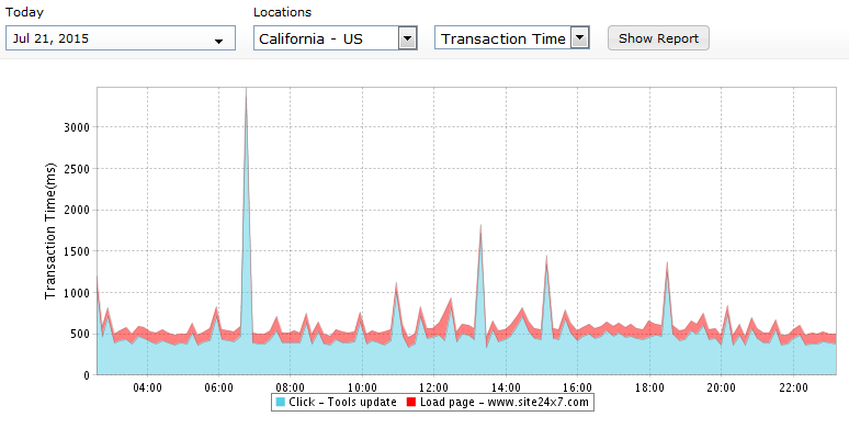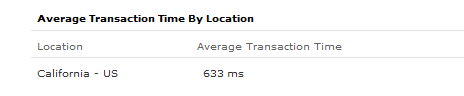 - Transaction Time and Transaction Time by Location indicate the location based time taken to complete a transaction for your recorded steps. Transaction time metrics of the Web Application Monitor are presented in a graphical format. Average Transaction time and Average Transaction time by Location data are presented in a tabular layout for easy assimilation.