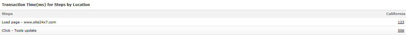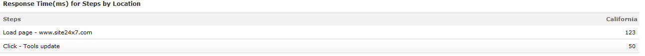 - Response Time (ms) for Steps by Location shows you the location wise time taken to download the entire HTML content of the web page.