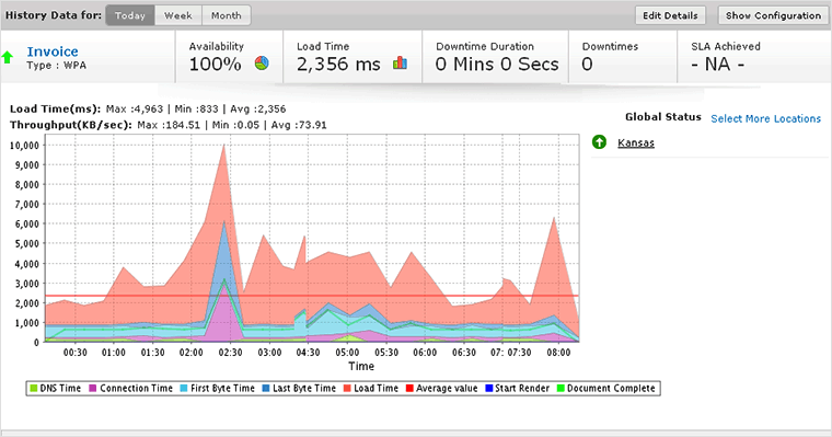 This section displays the historical information your website performance along with the availability, response time, load time, downtime duration, number of downtimes and SLA violation. The graph displays the response time of various factors such as DNS Time, Connection Time, First and Last Byte Time, etc. It also shows you the maximum, minimum and average load times (in milliseconds) of the webpage configured along with its Throughput values (in KB/sec). It also displays the global availability of the web page, if configured.