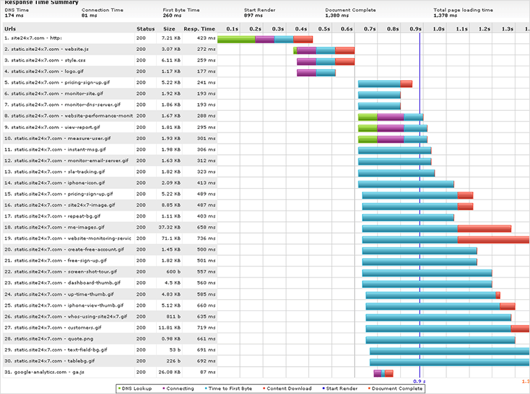Response time details for web page elements like HTML, JavaScript, CSS, images etc. is shown in a waterfall model under this section. Status code, size and response time of each element is shown in detail along with breakup of the response time. This breakup includes DNS lookup time, connection time, first byte time, content download time, render start time and document complete time.