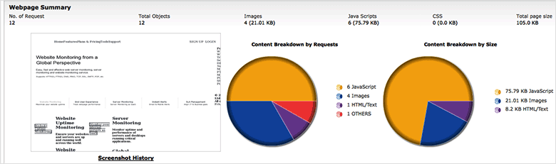 This section displays summary of all the elements of the web page that is being checked using real browsers. This summary will include number of requests sent before the page has finished loading, total number of objects in the page and the number of images, JavaScript and CSS included in the objects. This will also include the total size of the web page. Two pie charts; Content Breakdown by Requests and Content Breakdown by Size are displayed in the summary of the web page.
