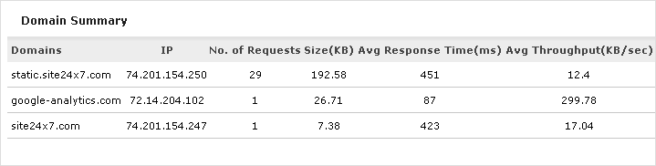 Other details that are included are size (KB) of each domain, average response time (in milliseconds) for each request and the average throughput value (content length/response time).