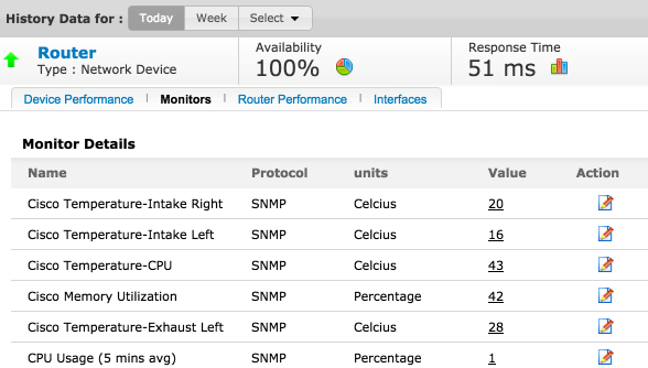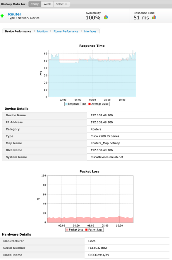 You can view the device performance snapshot under monitor details page. Inside the home page, click on the respective network device to access the monitor details page. Displays the system's details such as the IP address, operating system, time stamp of previous and next polls and a description on the system hardware details. System description is seen on the SNMP-enabled devices.