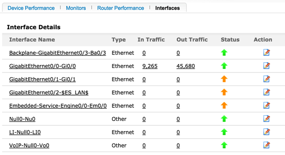 Displays the list of interfaces in the selected device with their status and other details. Click the interface name link to view its availability and graphs on traffic and bandwidth utilization.