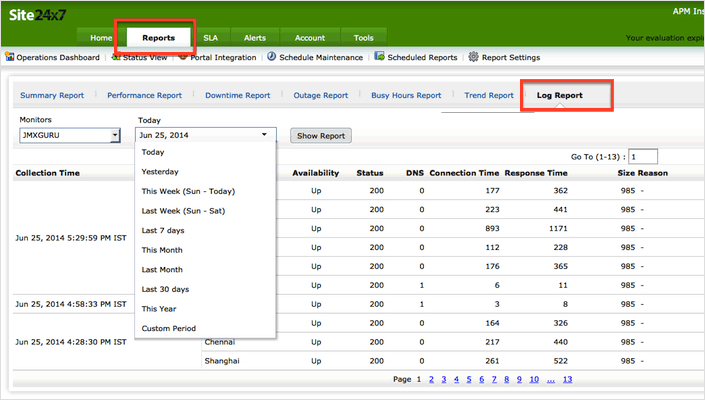 Log Report will show the monitoring location, time, status(up/down/trouble), response code and length of your configured monitors over a period of time. Reason for failure, if any, will also be shown in Log Report.