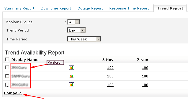 Trend Report shows the availability trend of your configured monitors over a specific time period. Trend Report gives an insight about how a particular website or application has performed during a particular trend period chosen by you. For example if you choose last week as your time period and trend period as Day; day-wise availability report for the previous week will be generated.