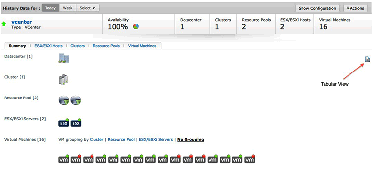 View the summary of Clusters and the availability of the underlying components such as ESX/ESXi hosts, VMs, etc.