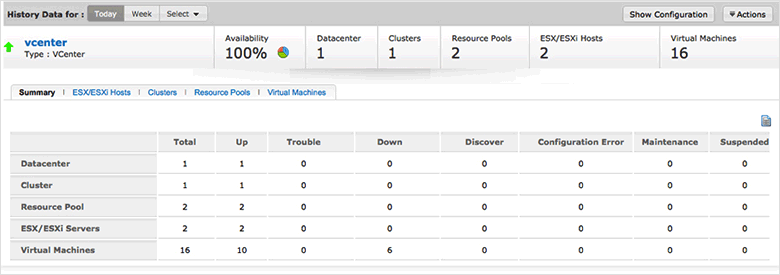 The History Data tab shows the overall availability of the Monitor and an overview of the different components of your vCenter Monitor. It also shows the number of data centers, clusters, resource pools, ESX/ESXi servers and Virtual Machines present in your vCenter server. Using History Data, details can be viewed for the current day, week or for a custom time period by selecting the drop down.