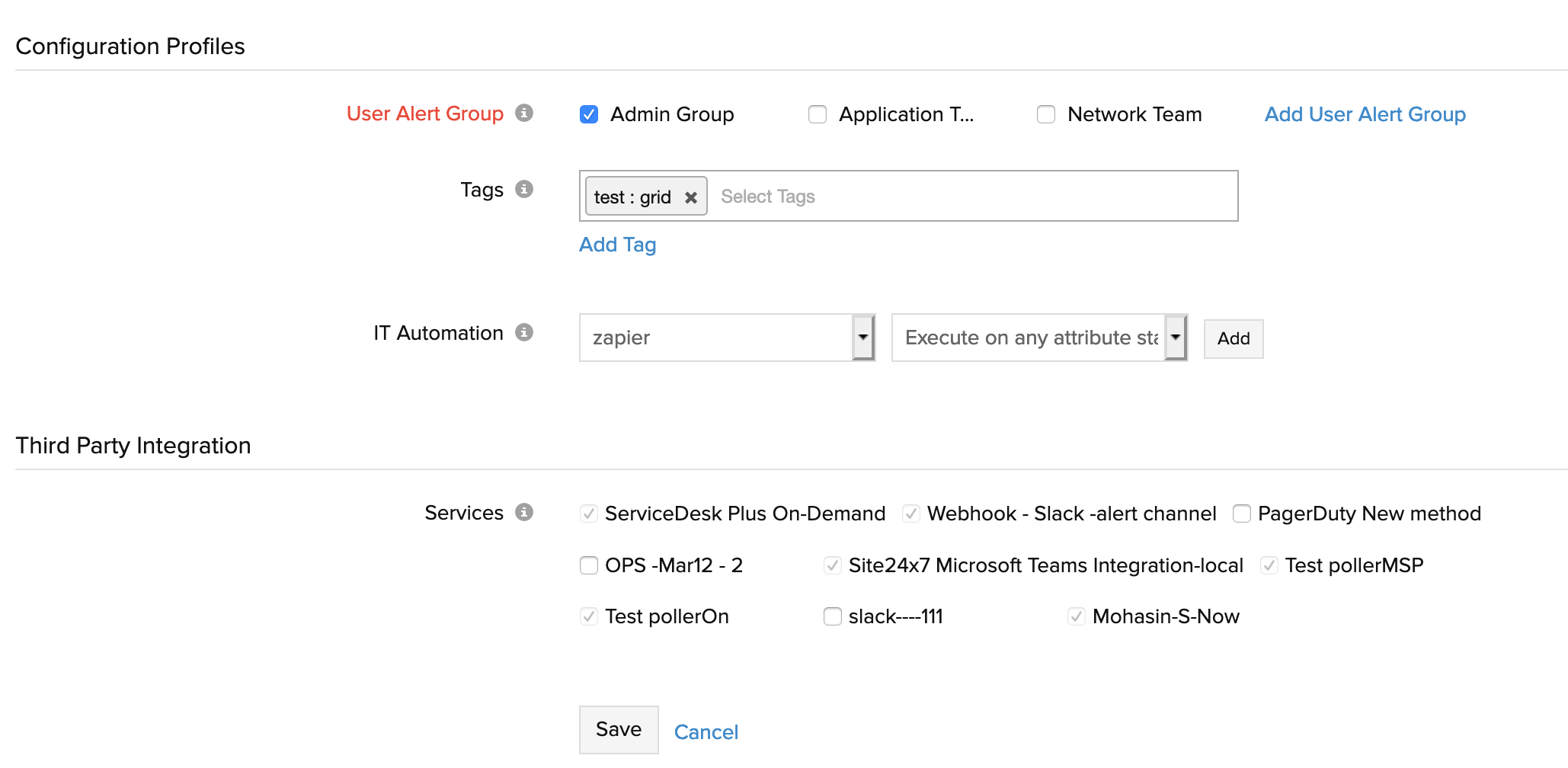 - User Alert Group: Select the user group that need to be alerted during an outage. To add multiple users in a group, see User Alert Group.