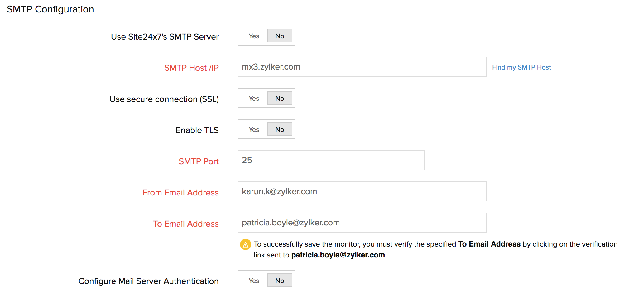You should submit email addresses that belong to you, to ensure that the emails sent from Site24x7 aren't ending up in the spam folder. Once you submit the To and From email addresses, we'll be sending verification emails to both the addresses. The monitor will be added only you verify both the email addresses.