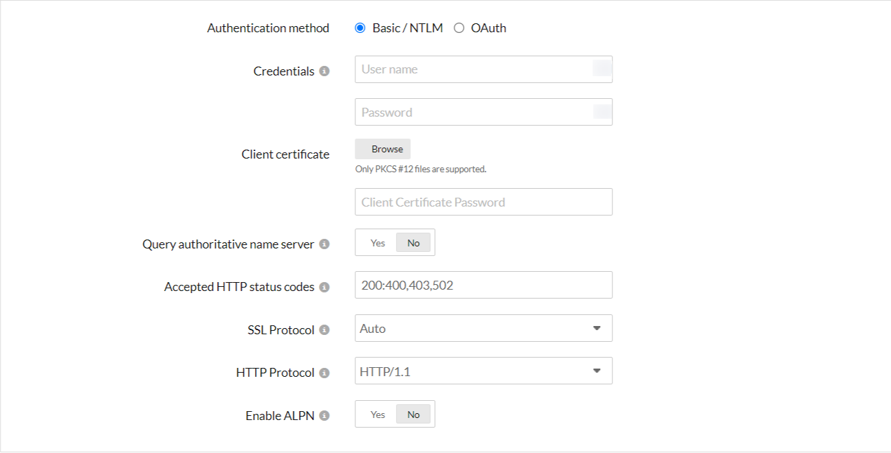 - Enable ALPN: Enable ALPN to ensure that only supported application protocols are sent as part of the TLS handshake and ensure reduced round trip time. By default, it'll be set to Yes. Enable ALPN option isn't supported by On-Premise Poller. We'll be extending the support in the next update.