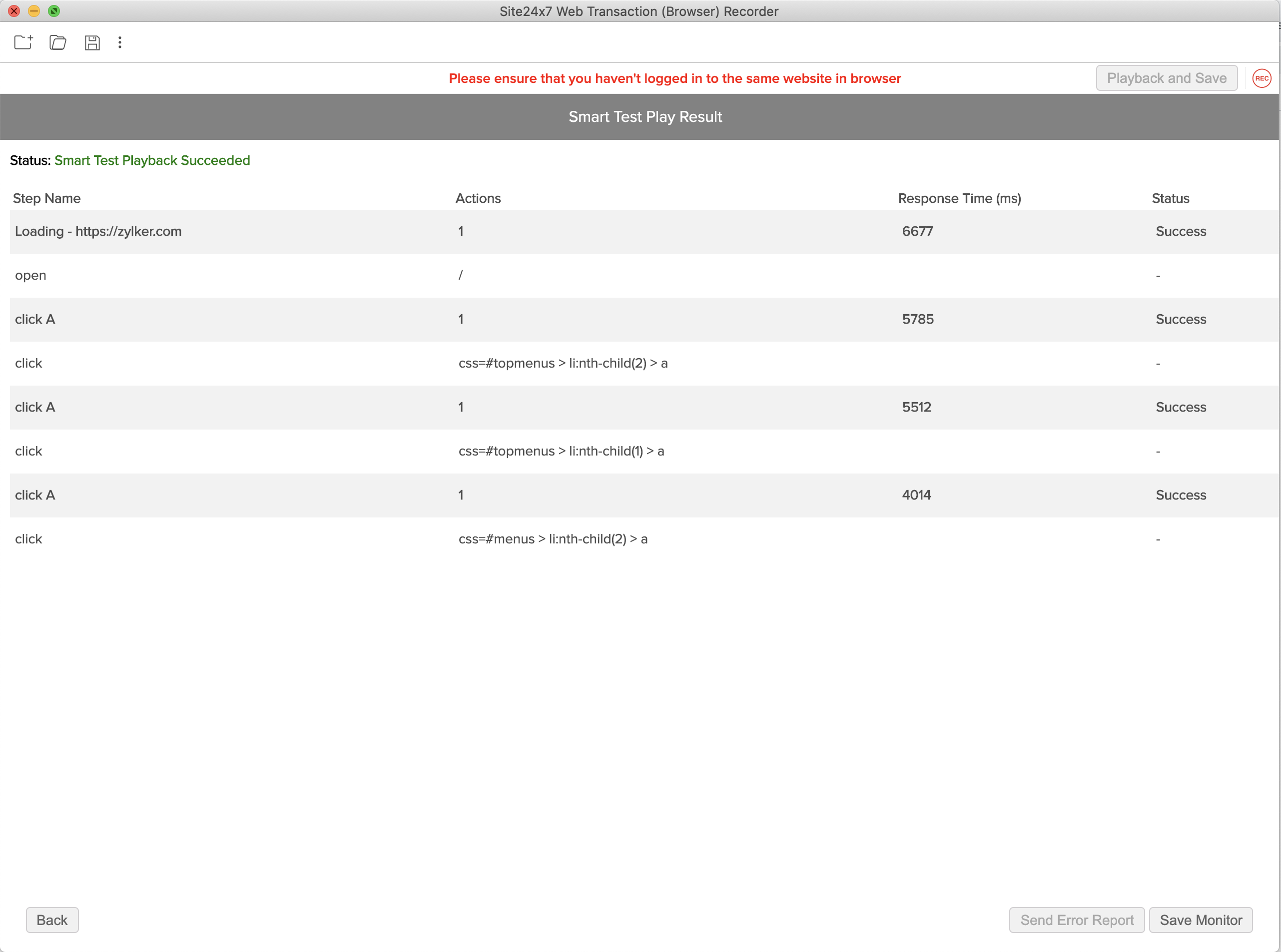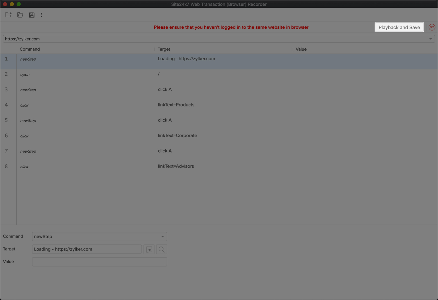 - Save your transactions: Save your transactions for monitoring once the transactions are recorded. A maximum of 20 transaction steps can be recorded. Site24x7 will then keep simulating these actions continuously, scanning for any sign of trouble.
