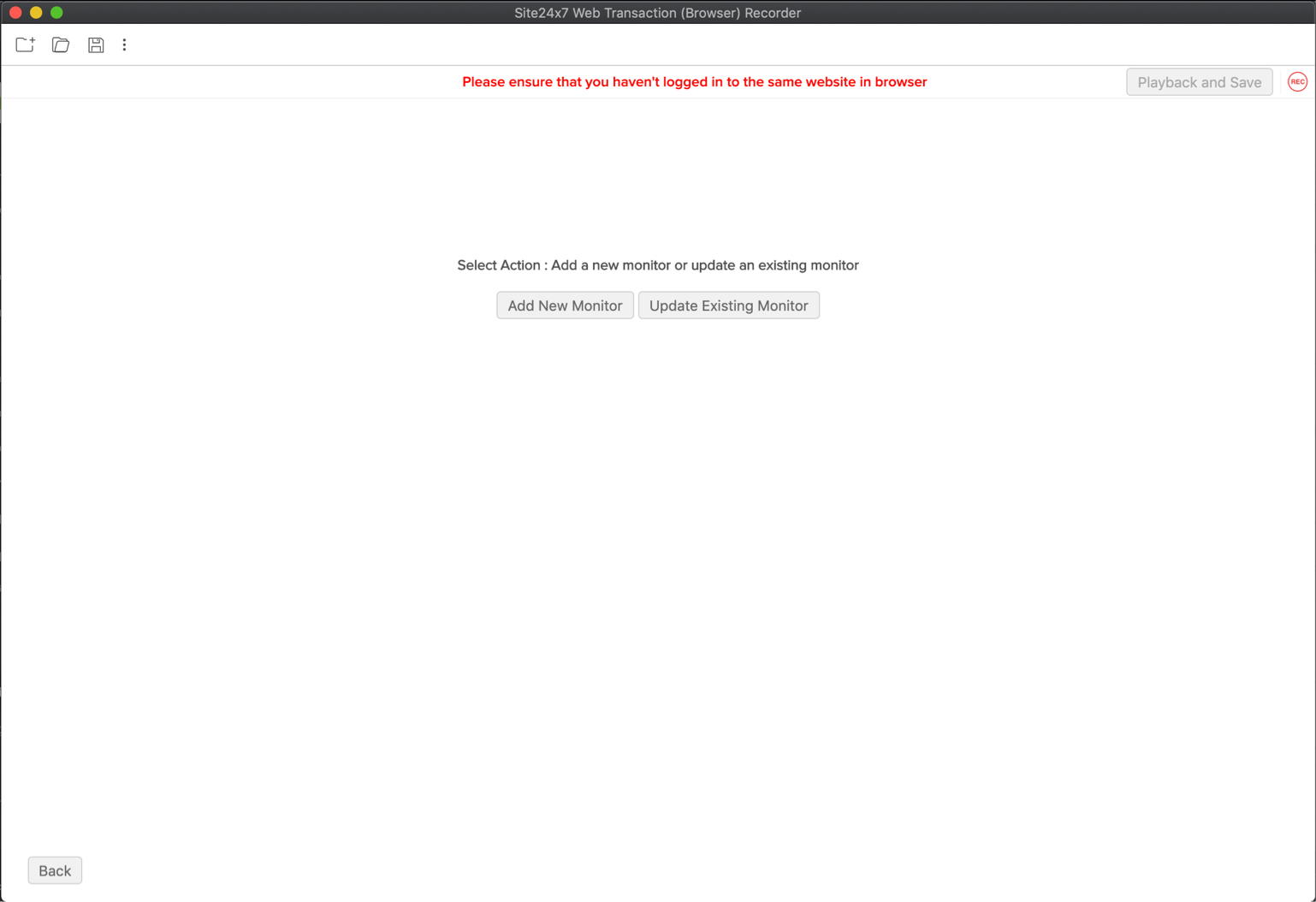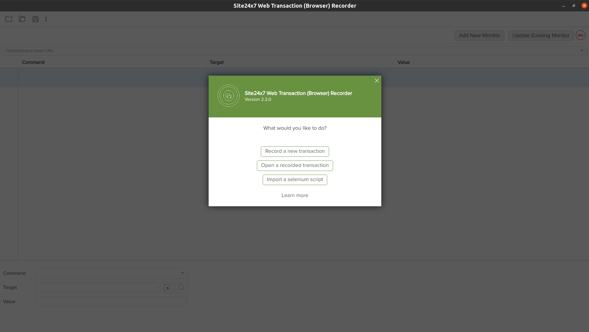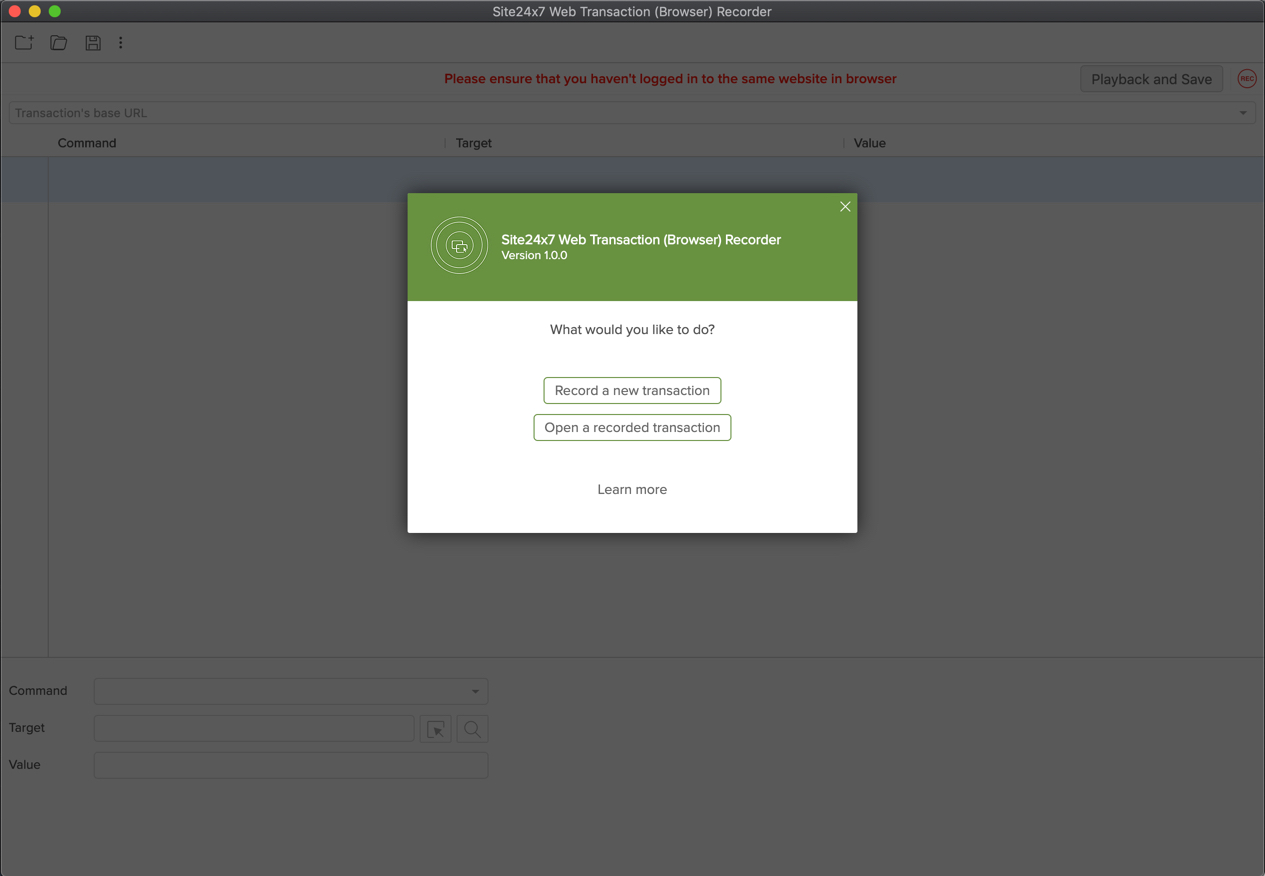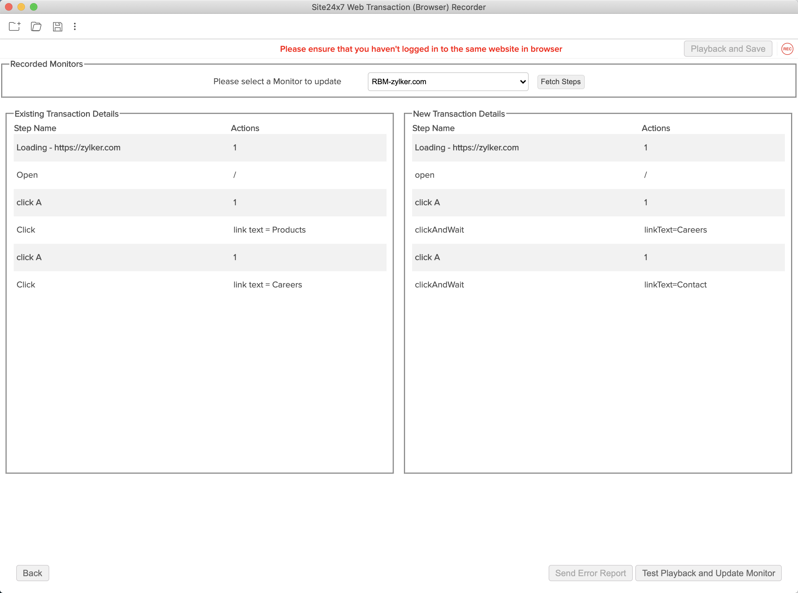 Install the Web Transaction (Browser) Recorder add-on, which records all the user interactions in your web application in their exact sequence and notifies you when an error is detected. This monitoring feature will use an actual browser, Firefox or Chrome, to play back the captured web transaction.Record a new web transaction using a browser add-on