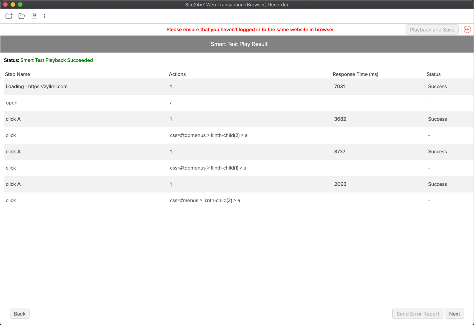 - If you encounter a Test Playback Failure, click the Send Error Report button to send us a report or contact support@site24x7.com.
