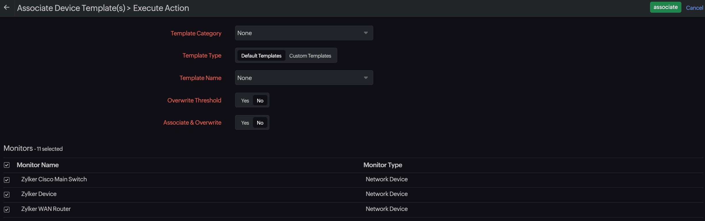 - Associate Device Template(s): Link a device template to multiple network monitors. You can choose to overwrite existing templates if necessary.