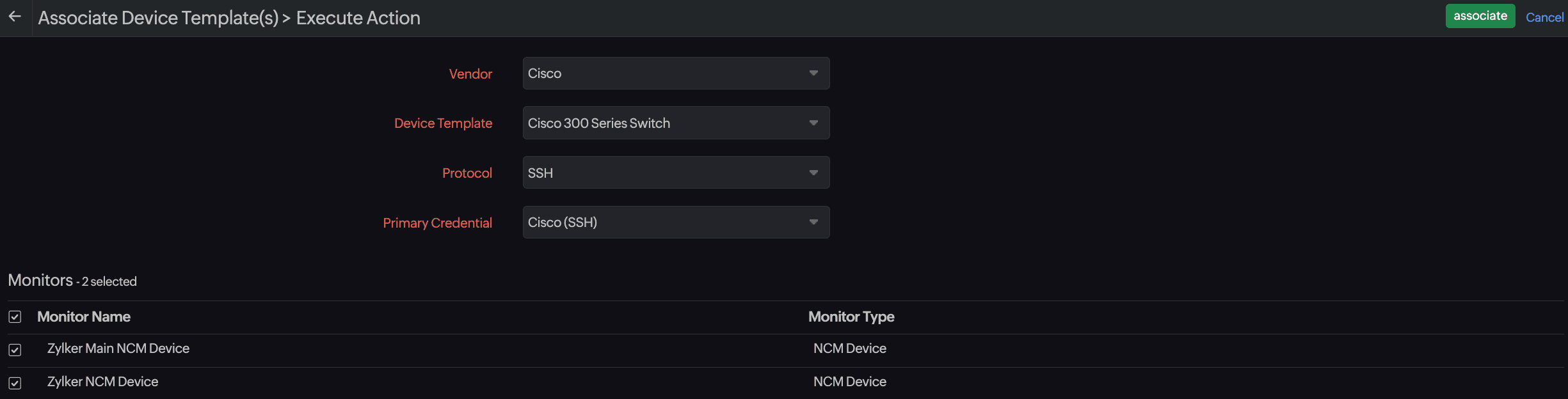 - Associate Device Template(s): Link a device template to multiple NCM devices to standardize configuration management.