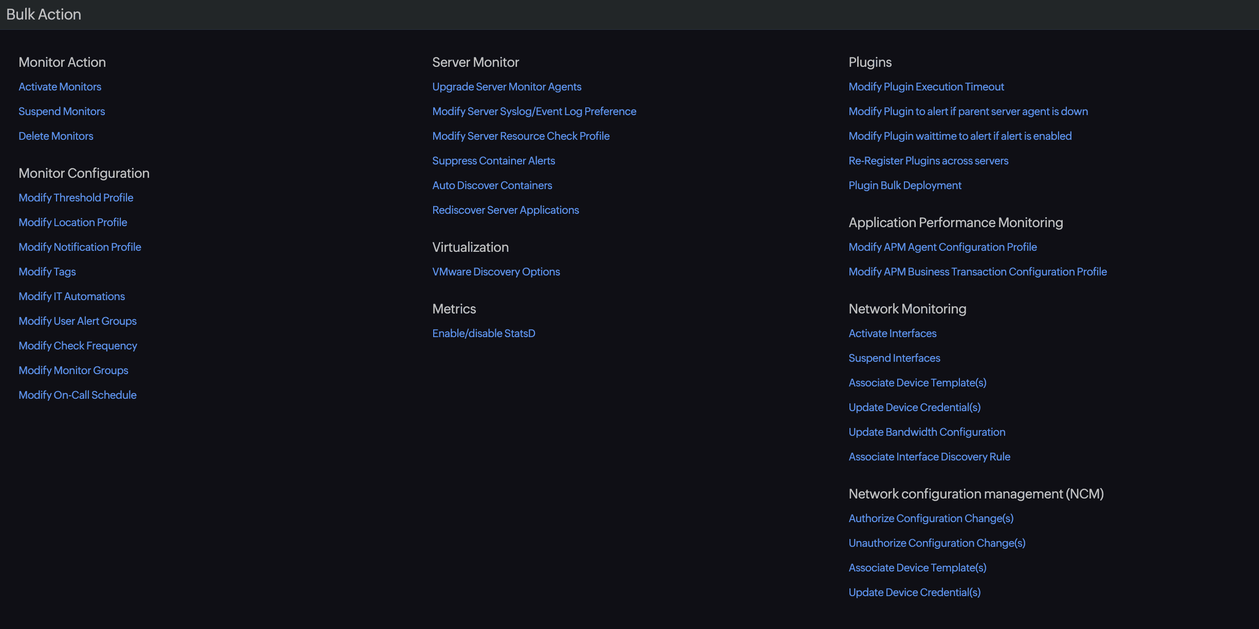 Bulk updates allow you to manage device templates, credentials, bandwidth configurations, interface discovery rules, and configuration changes across multiple monitors simultaneously.