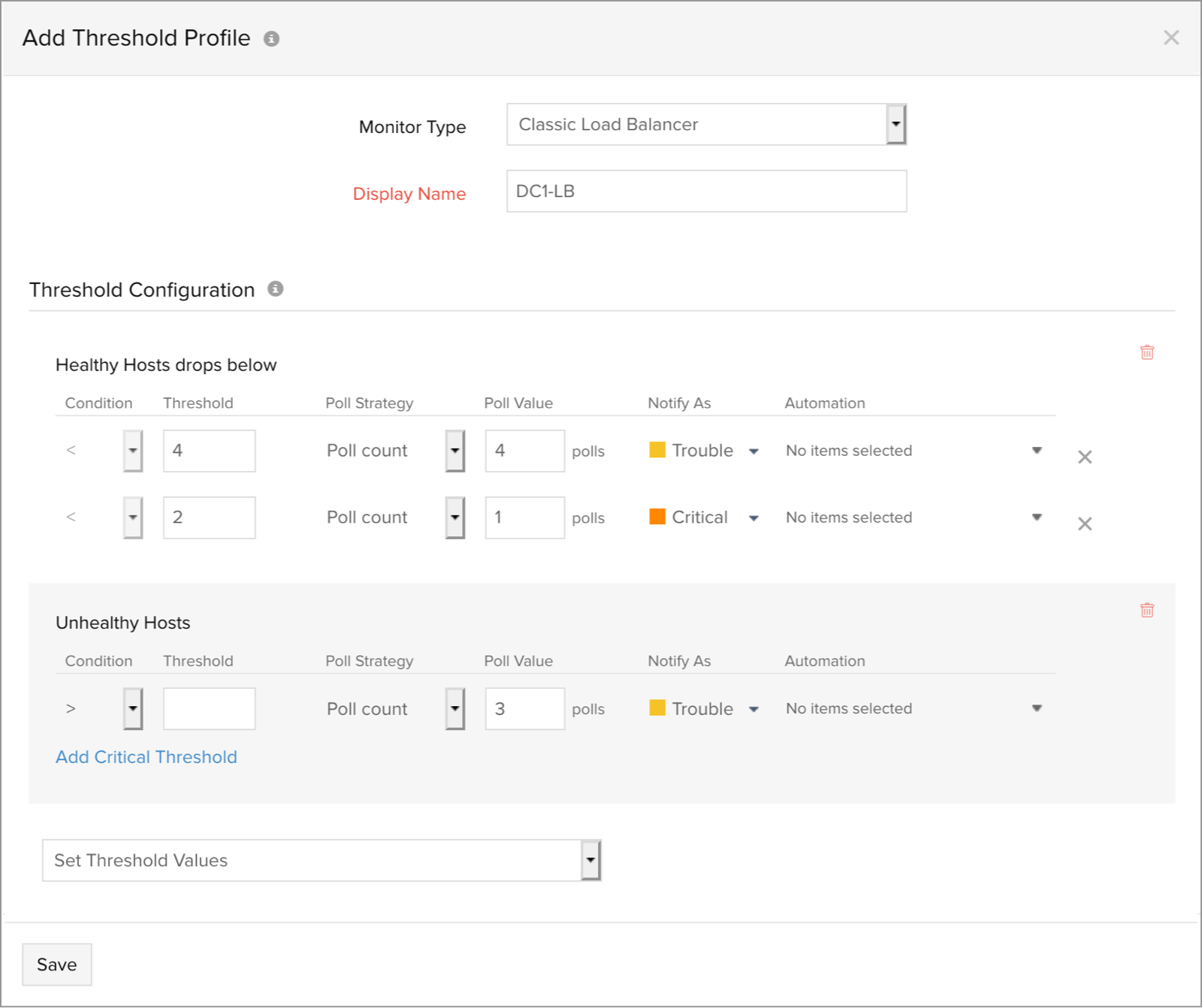 - Unhealthy Host Count: Enter a value and get notified with trouble alert when the CPU Unhealthy Host count ]exceeds the set value.