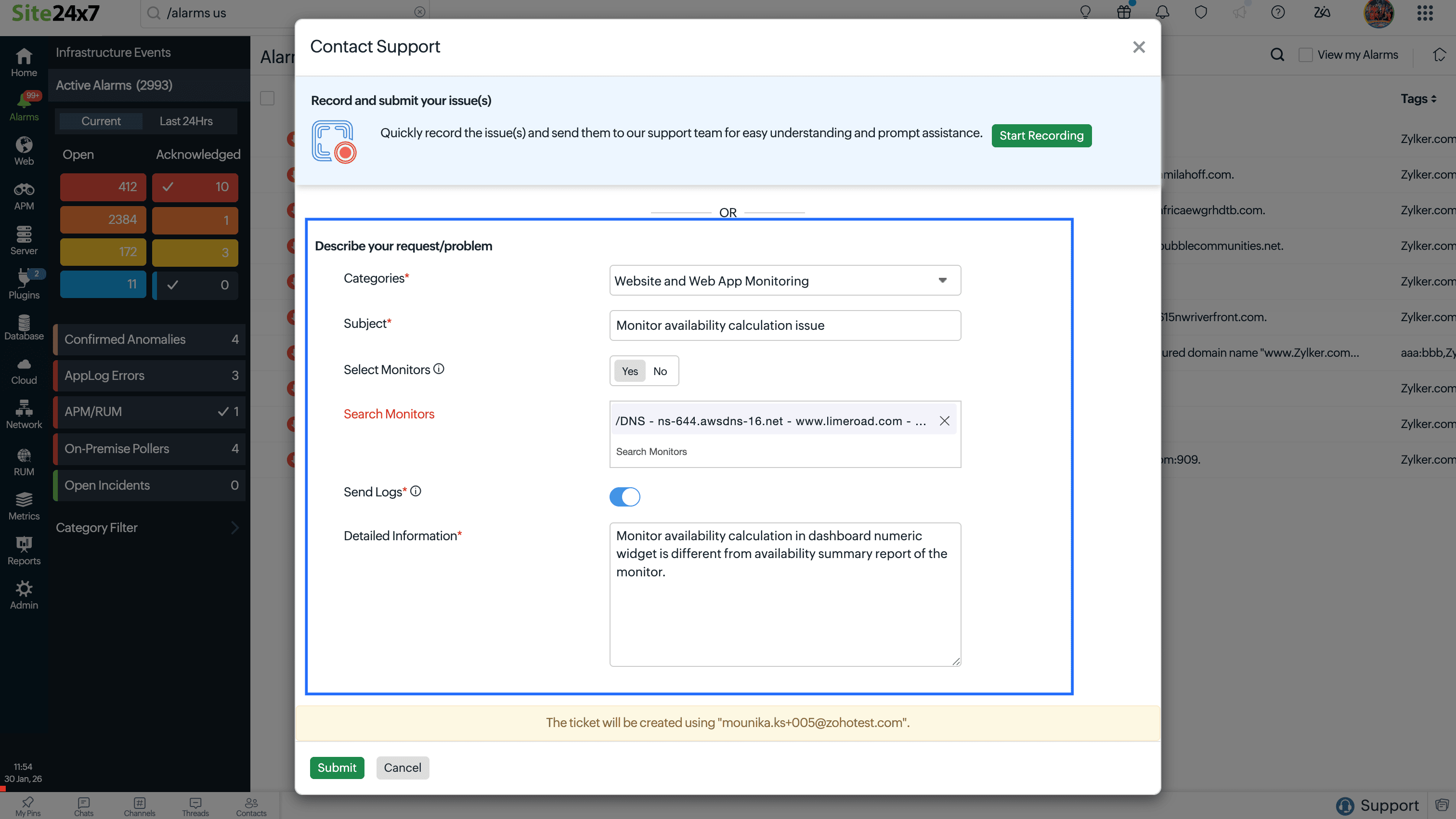 You can also reach the Site24x7 support team by emailing support@site24x7.com with your question and relevant details. Our support team will review your request and respond promptly to help resolve your issue.