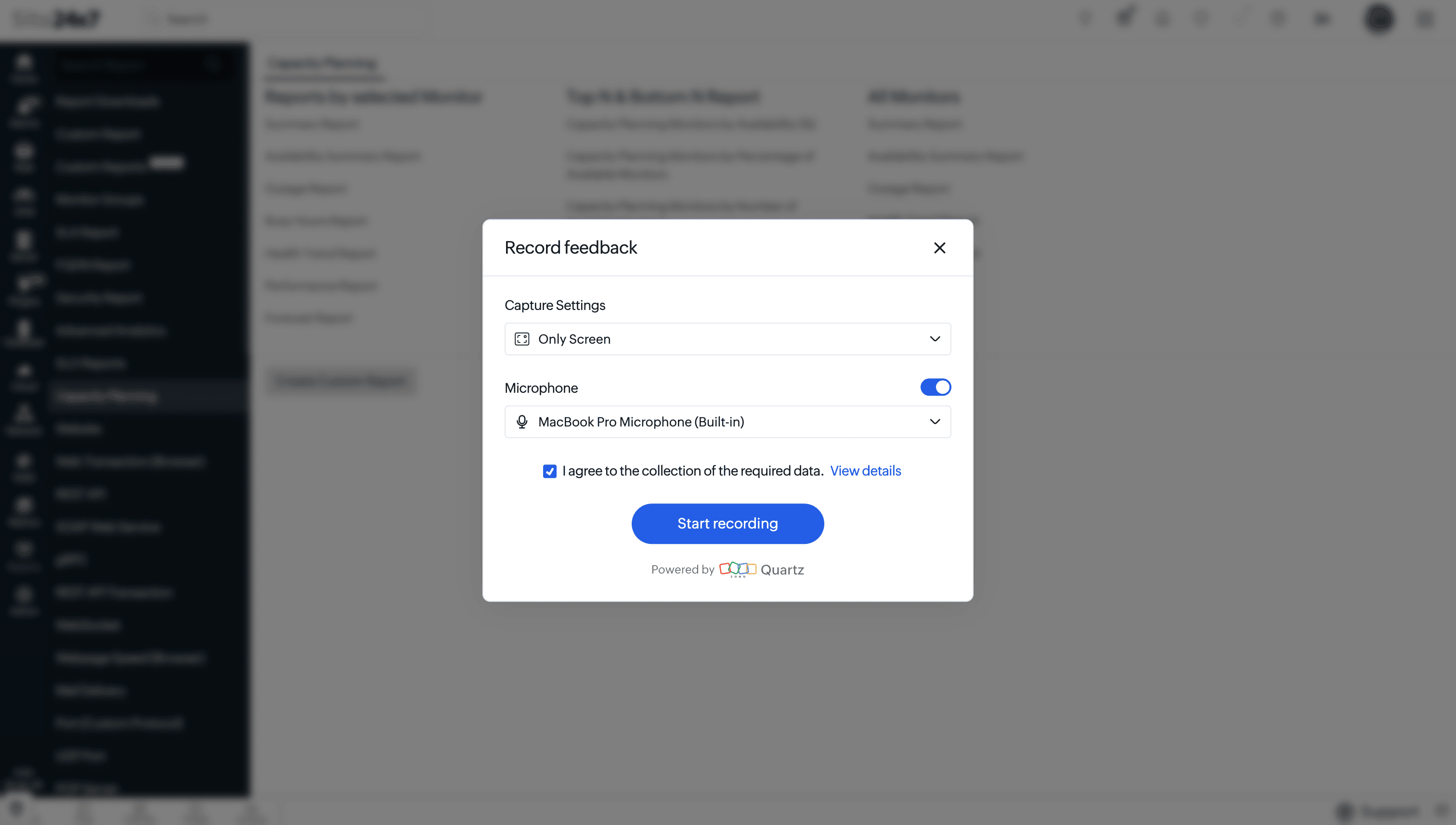 2. In the Record feedback pop-up, fill in the details, provide consent for Site24x7 to collect data via Quartz, and click Start recording.