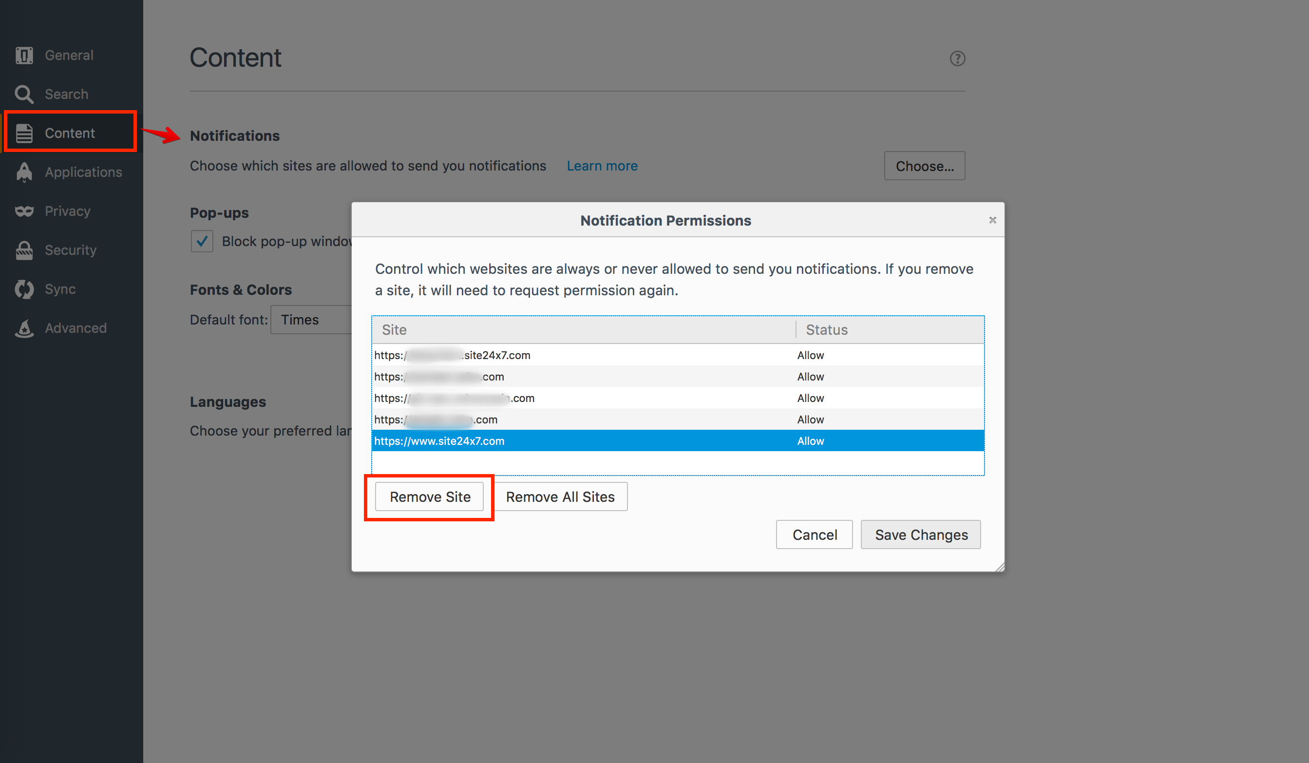 Notification Permissions lets you control which websites are always or never allowed to send you notifications. If you remove Site24x7, it will need to request permission again.