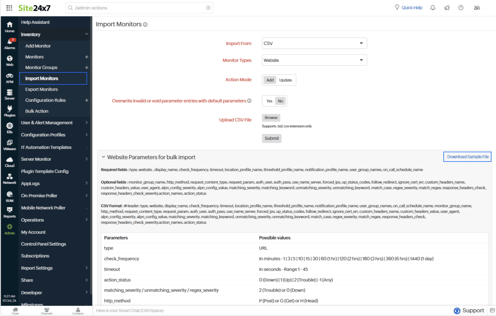 - For bulk importing specific monitor types, there is a list of required parameters at the bottom of the Import Monitors page on the web client. Save and update these parameters in a CSV file with either a .csv or .txt extension, and then upload this file to Site24x7.