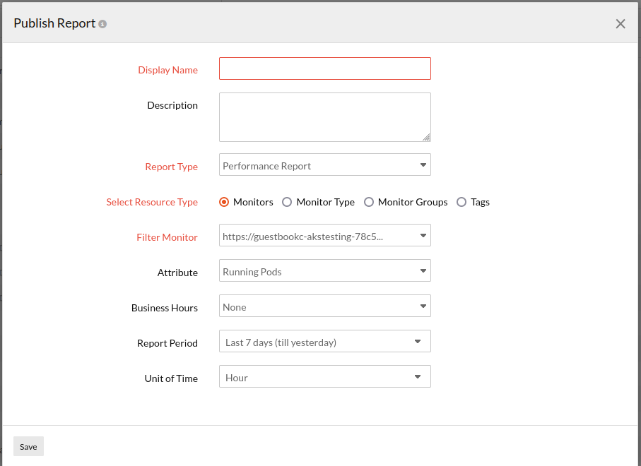 • Select Resource Type: Select the required monitors, monitor groups, or tags radio button to make the reports public. Specify the relevant Monitor(s), Monitor Group(s), Monitor Types, or Tag(s) for which the reports are to be published.