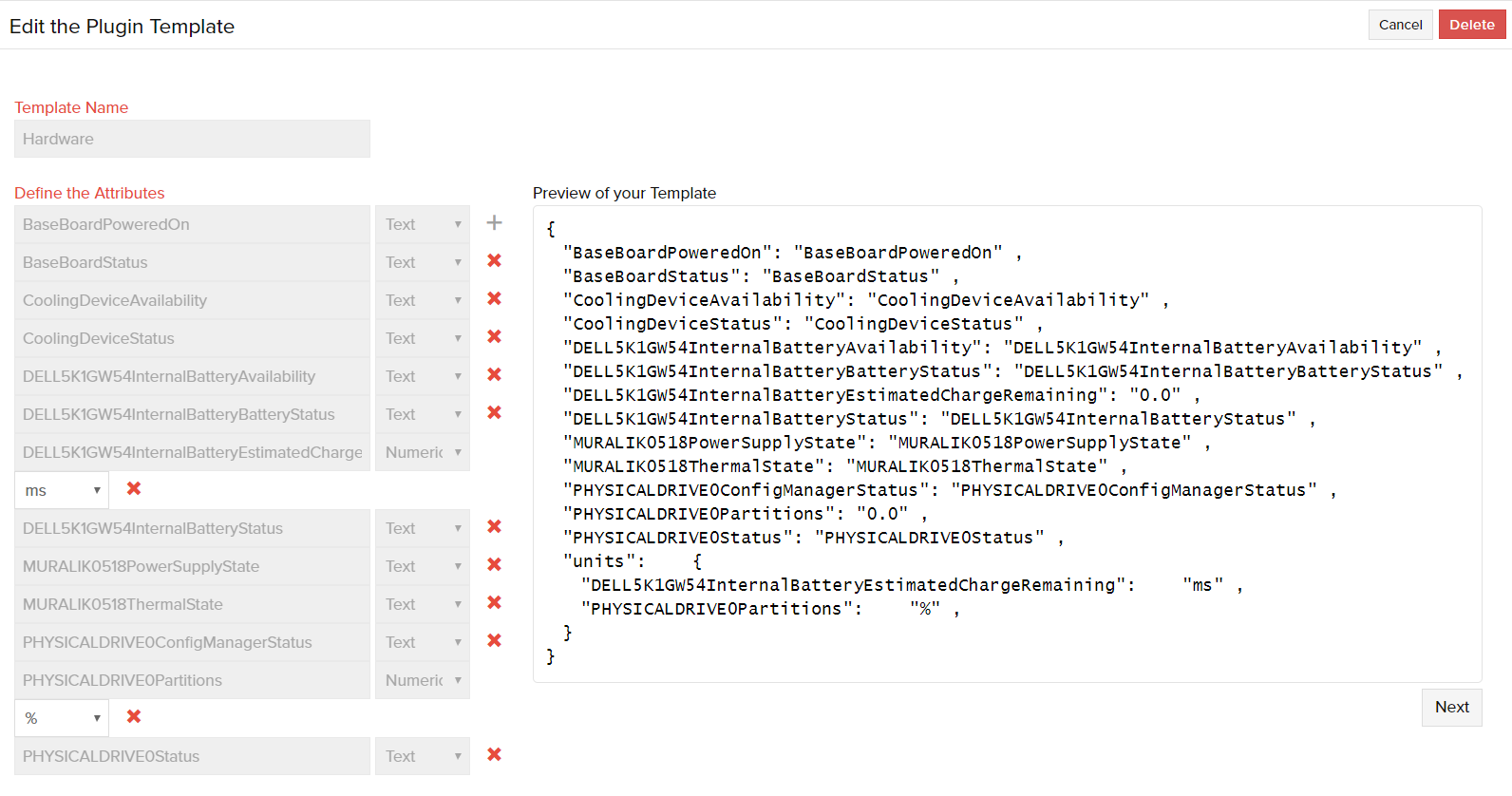 - Modify/add units to existing attributes. Get a preview of your template as you make changes. Click Next.
