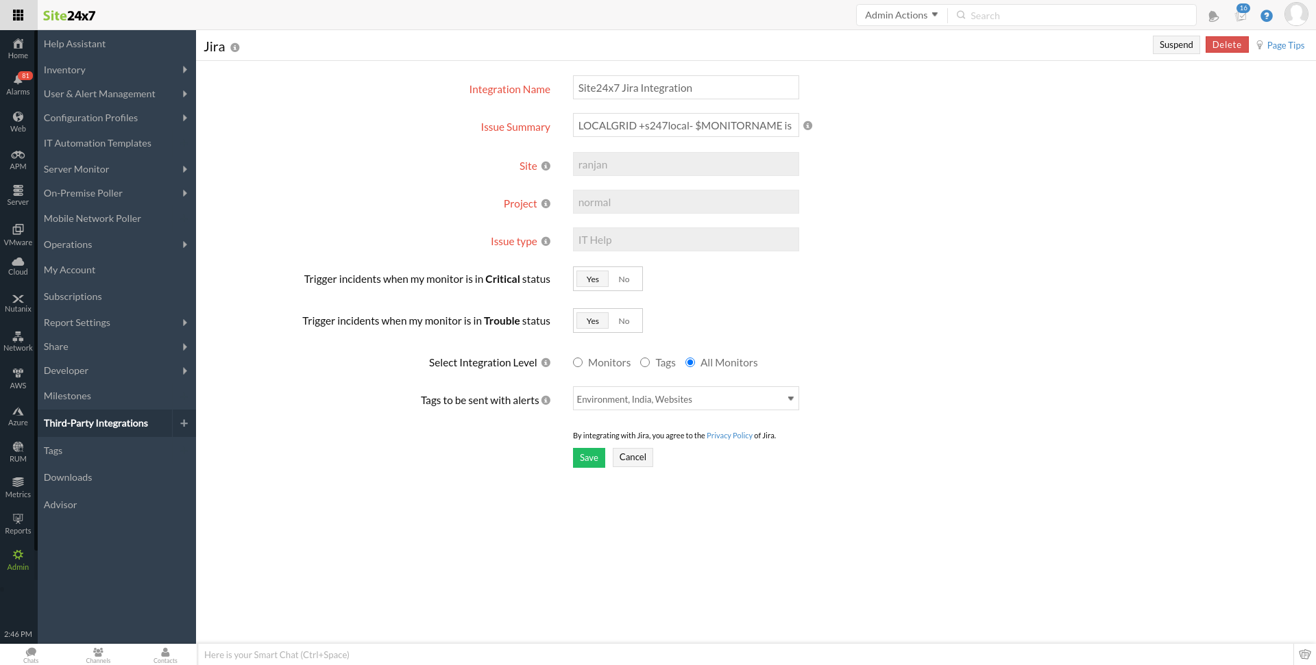 - Go to Site24x7 Admin > Third-party Integration > Jira.