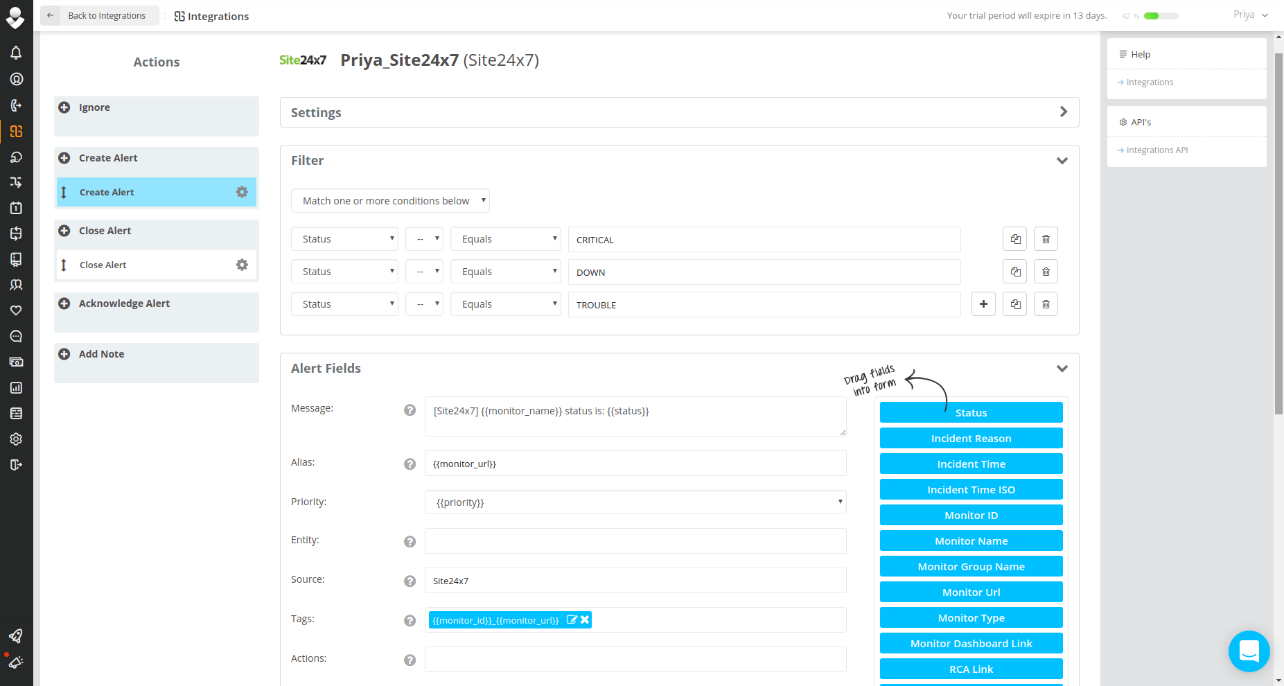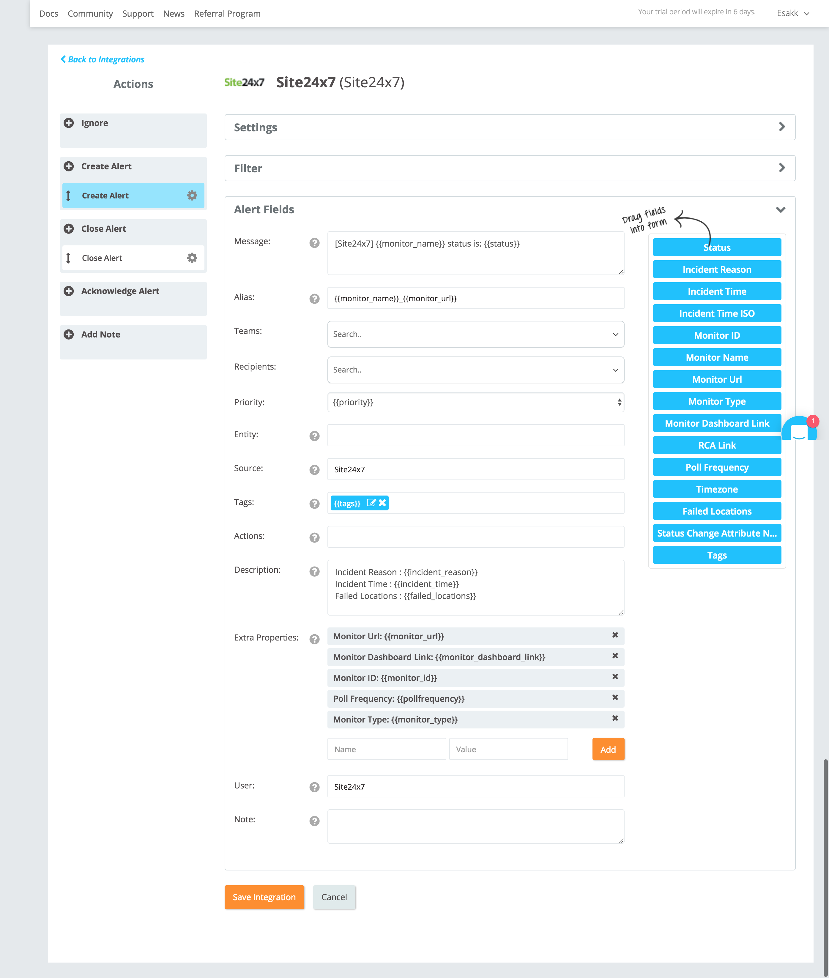 In the Settings section, provide Name, API Key, Suppress Notifications, Tags, and Extra Properties.Using the params under Extra Properties, Opsgenie will parse Site24x7 data to construct rich and informative incident tickets. You can use dynamic fields to customize alert properties - automatically parsing out a variable from the payload, every time you create an incident ticket according to Alert Fields settings.