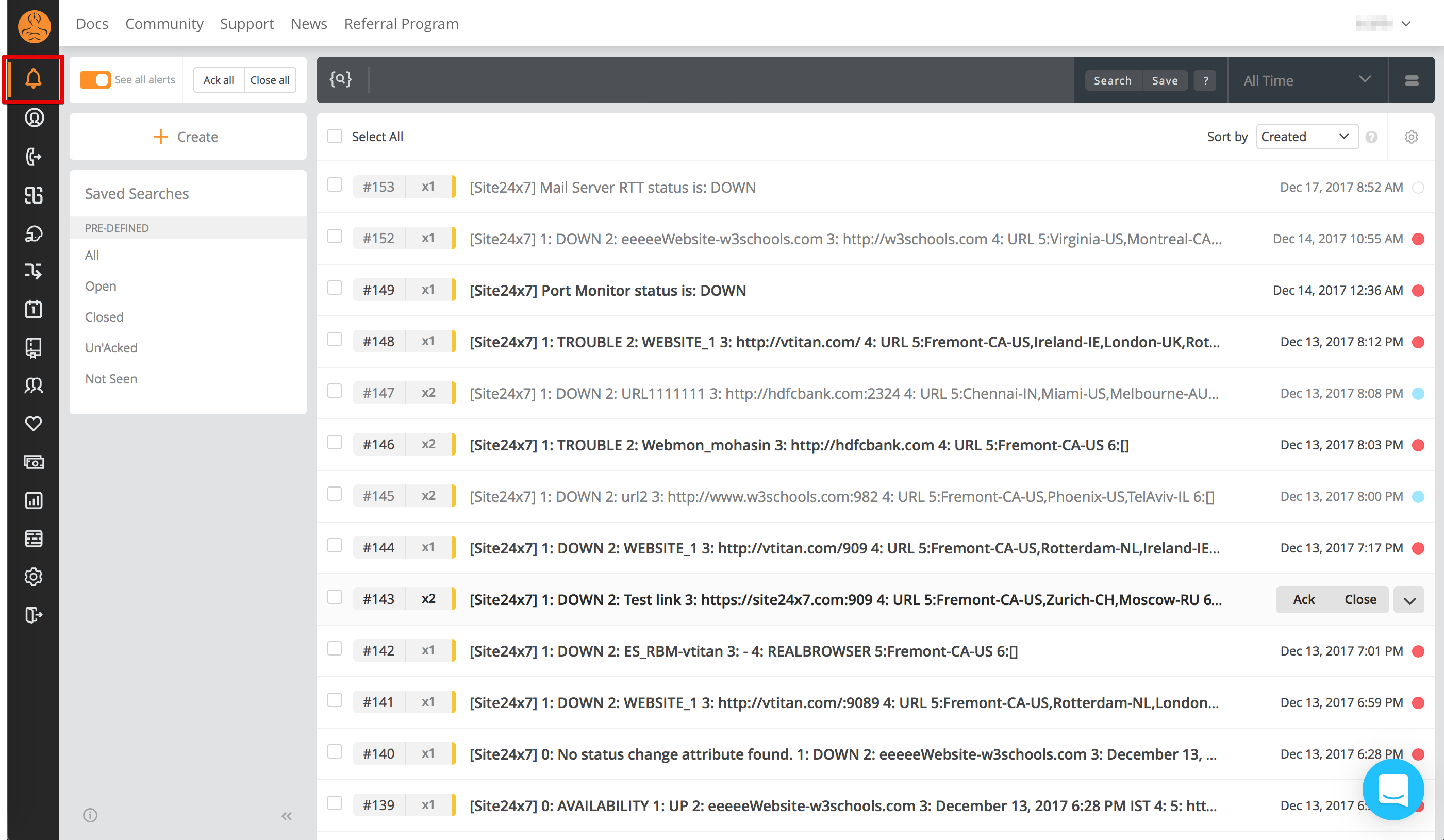 After a successful integration, Site24x7 status alerts are posted to the Opsgenie Hook URL, which inturn creates incident tickets in the Opsgenie account. You can acknowledge an incident ticket in Alerts tab, delegate it to someone, snooze it temporarily, or even delete it permanently. You can gather more insight into the alert and resolve issues faster. After a brief period of outage, when a Site24x7 monitor's status changes to UP, the relevant incident ticket closes automatically inside the Opsgenie dashboard.