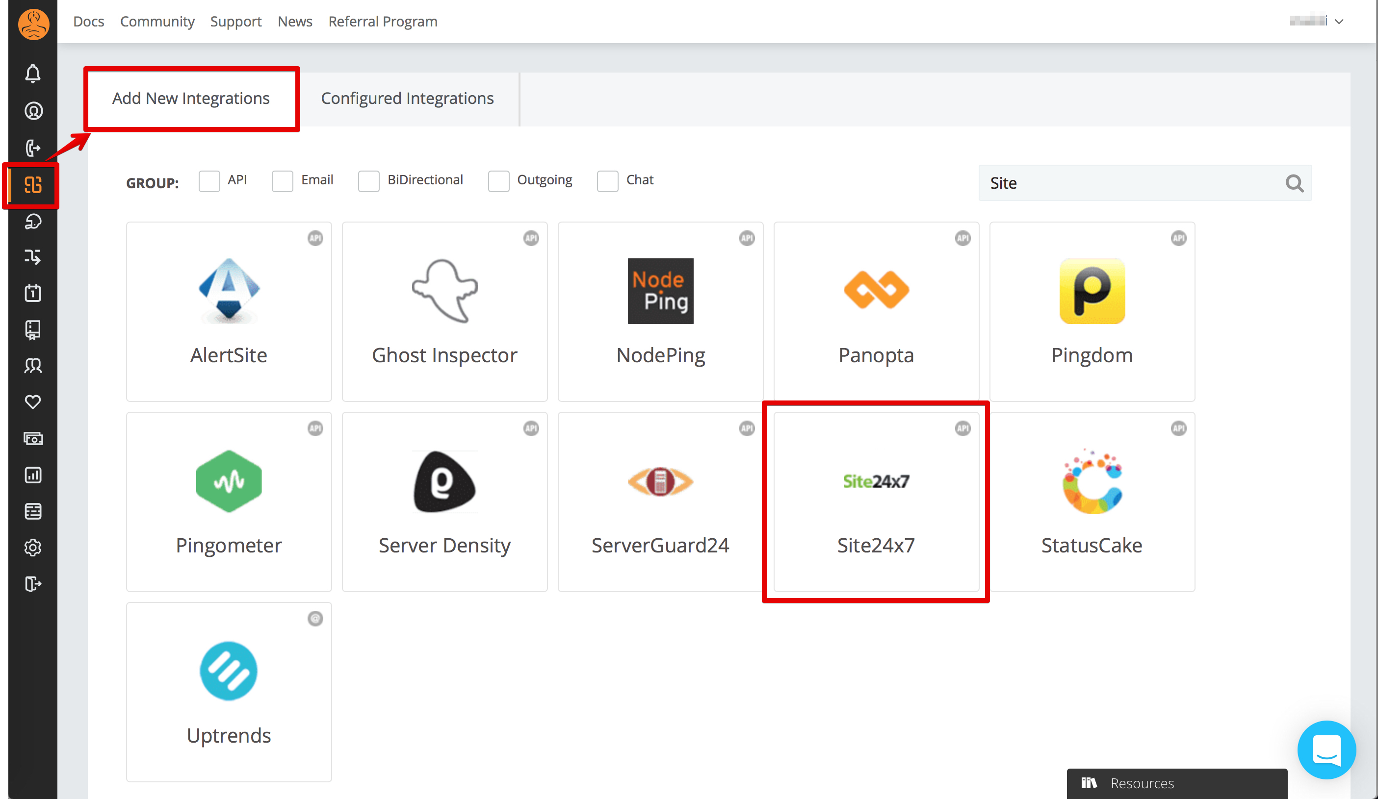 - After adding the team, you'll be redirected to the Integrations page. Click the Add Integrations button and click on Site24x7 from the list of integrations.Then click Add.