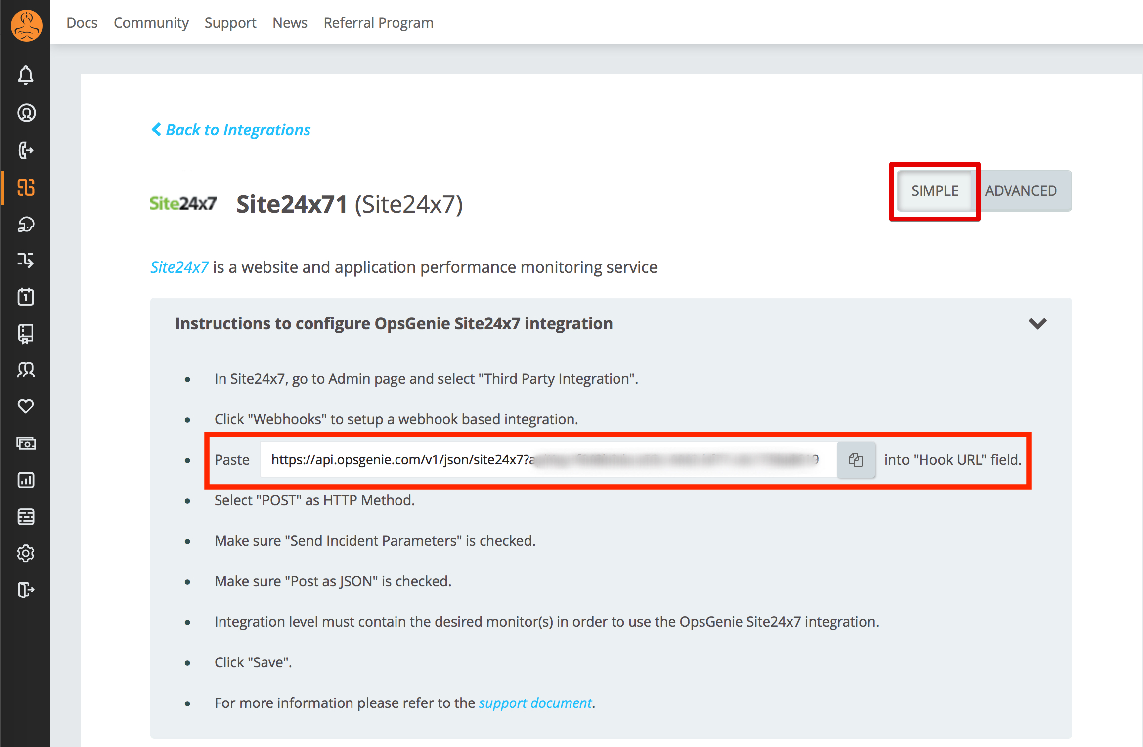 Copy and securely retain the Hook URL provided by Opsgenie. After successful integration, Site24x7 will post status alerts to this Opsgenie Hook URL.