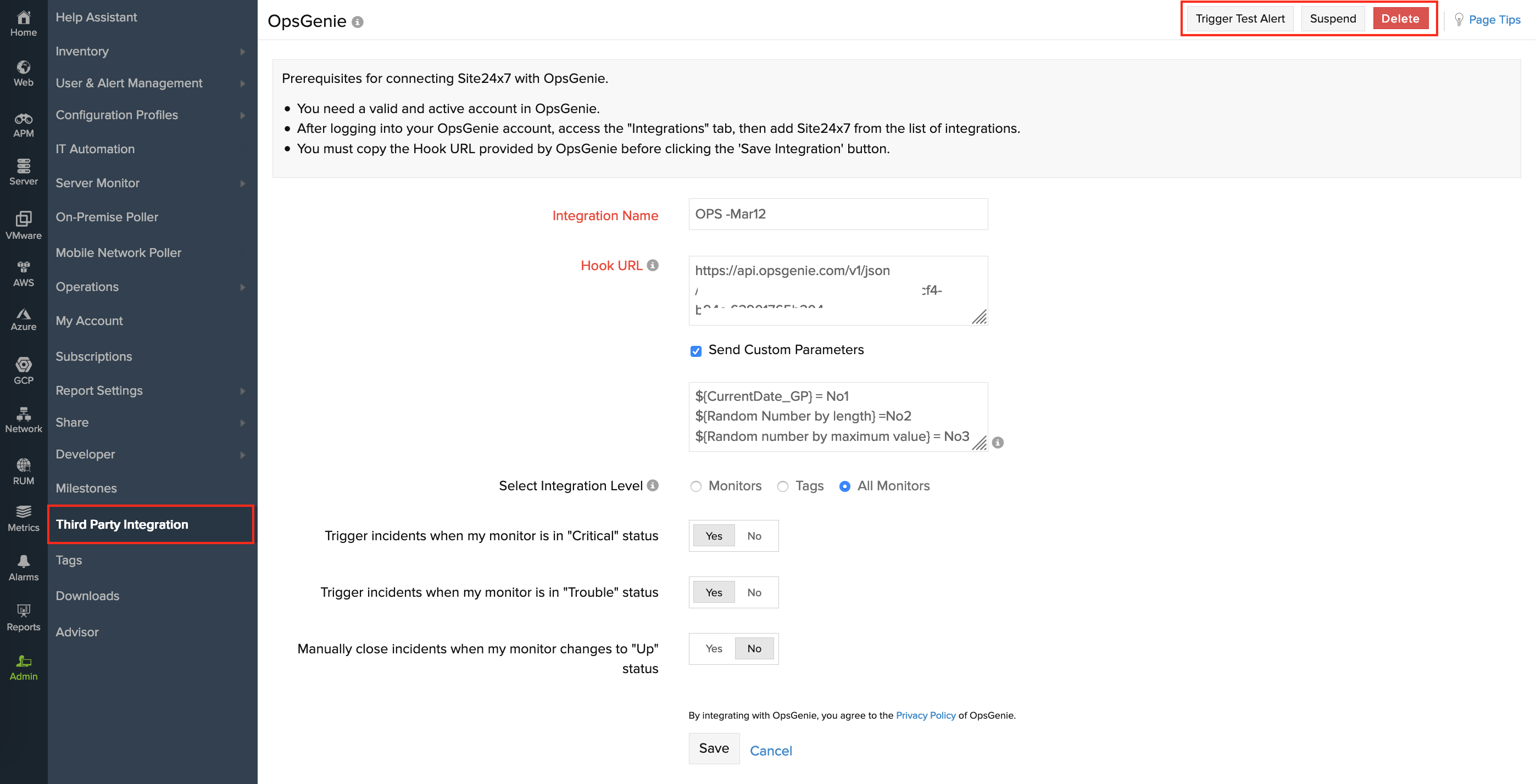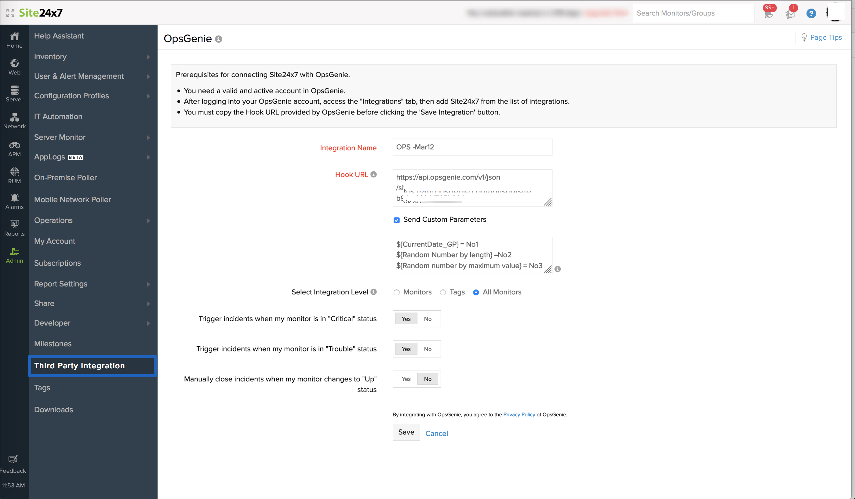 1.Enable Custom Parameters in Site24x7 Opsgeneie Integration page.