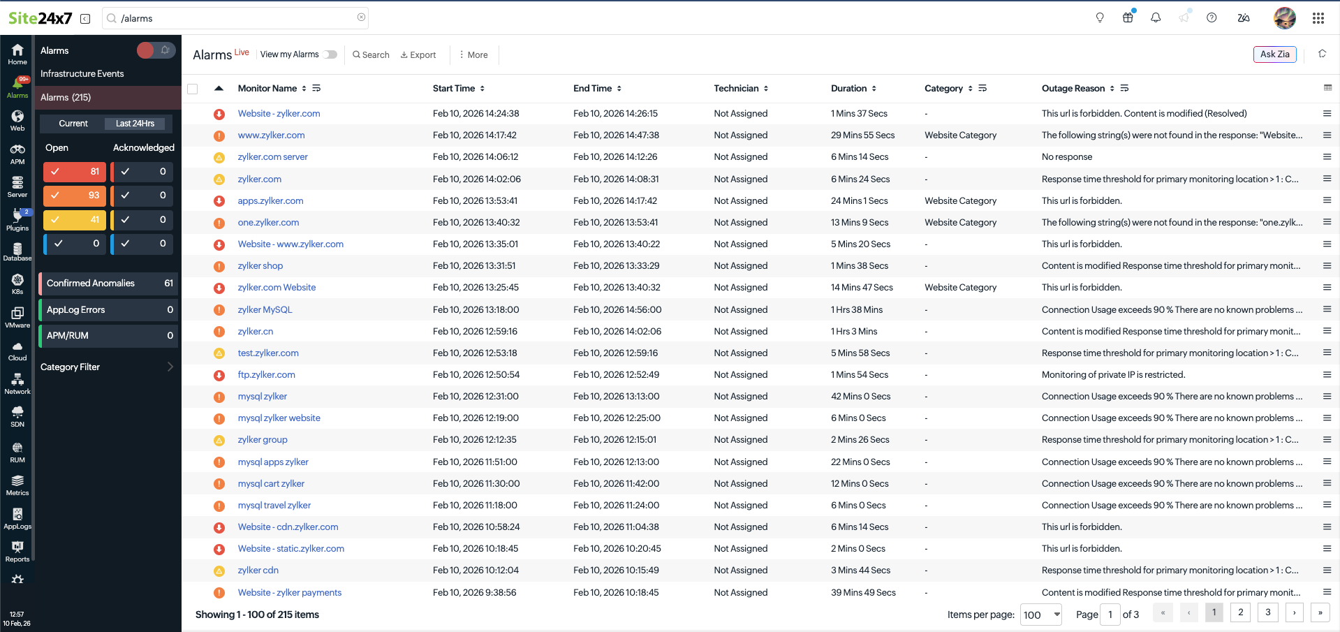 The Alarms page provides a comprehensive summary of the alarms for your monitors. It enables you to view the number of alarms for a specific monitor, analyze alarms over a specific time period, check the frequency of critical alarms for a monitor, and even access root cause analyses for past alarms. Zia consolidates this data directly from Site24x7 into a clear, actionable report.