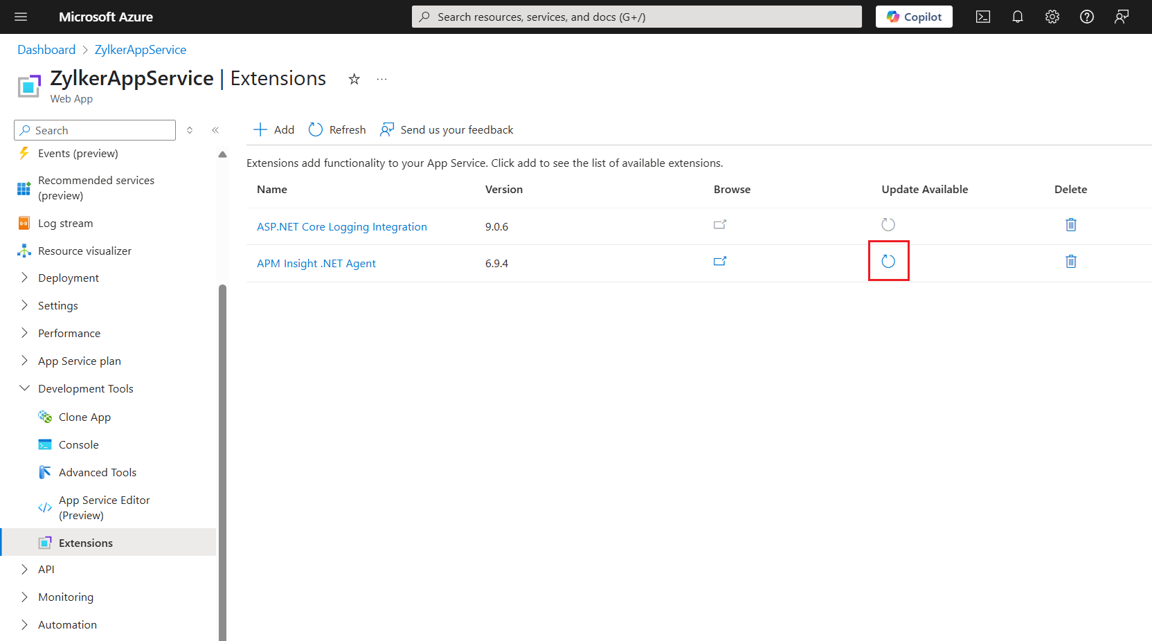 - Whenever an update is available, it is indicated on the extension APM Insight .NET Agent.