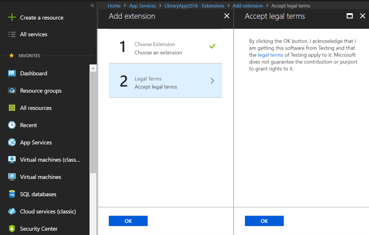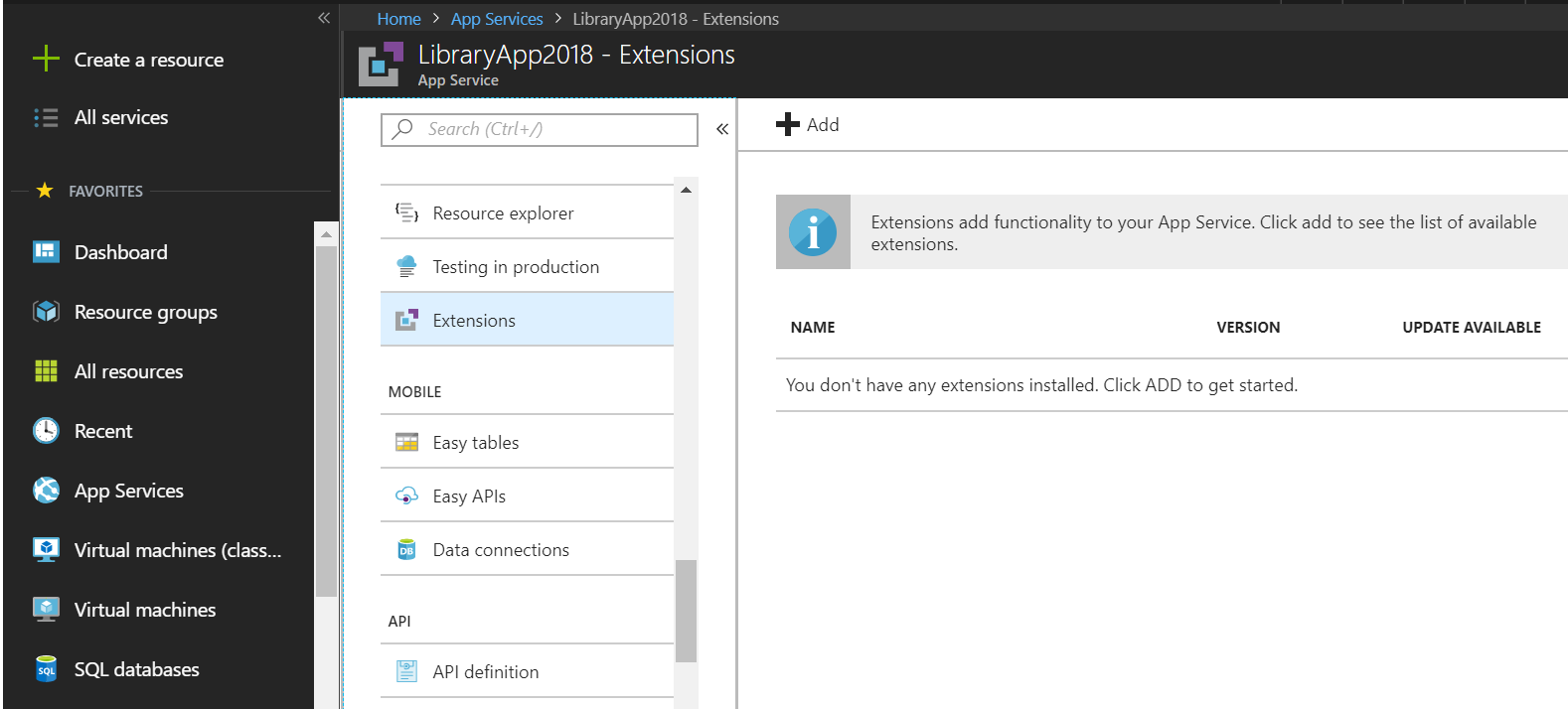 - Now, navigate to the Extensions tab in Azure App Services and click Add