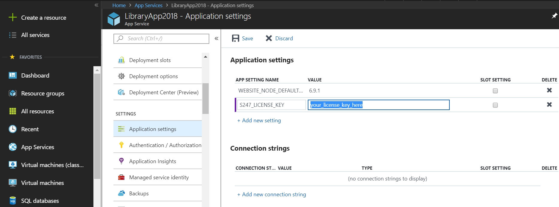 - Copy the license key from the Site24x7 portal and add an app setting key value for the license key in the App Settings tab as shown below: