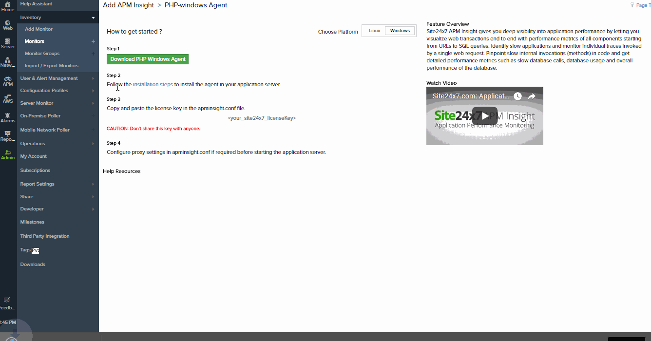 - Download the APM Insight PHP agent msi from the Site24x7 console.