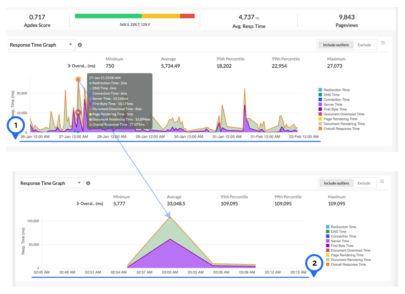 Figure 2 shows data for one week, ranging from Jan. 26, 2020 to Feb. 2, 2020. Upon clicking the response time peak that occurred on Jan. 27, we can see granular details of the peak for before and after 15 minutes, as shown in Figure 3.